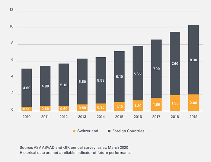 The share of online business in total retail trade is still relatively low. In February, the Swiss mail order trade association (VSV ASVAD) together with Swiss Post and the German consumer research firm GfK published an interesting survey on this subject. It revealed that the total volume of Swiss retail trade in 2019 stood at CHFbn 91.6, of which the online segment accounted for 9.1%. While retail as a whole has been more or less flatlining for years, the e-commerce sector is growing strongly. In 2019, Swiss consumer spending online breached the sound barrier of CHFbn 10 (see graph). A good 80% of these purchases were made within Switzerland, i.e. on .ch domains. This ties in with the fact that last year Digitec/Galaxus was the first Swiss company to post online sales of more than CHFbn 1. View more information on investment solutions on the topic “The Corona economy: profiting from the new world”.